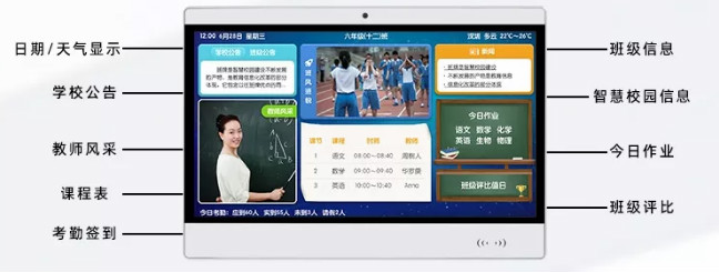 2、安裝在教室門口,除了展示班級(jí)信息、每日課程安排、授課老師、值日安排、班級(jí)文化展示、班級(jí)評(píng)比、榮譽(yù),活動(dòng)視頻等,還能顯示學(xué)校通知,公告等。